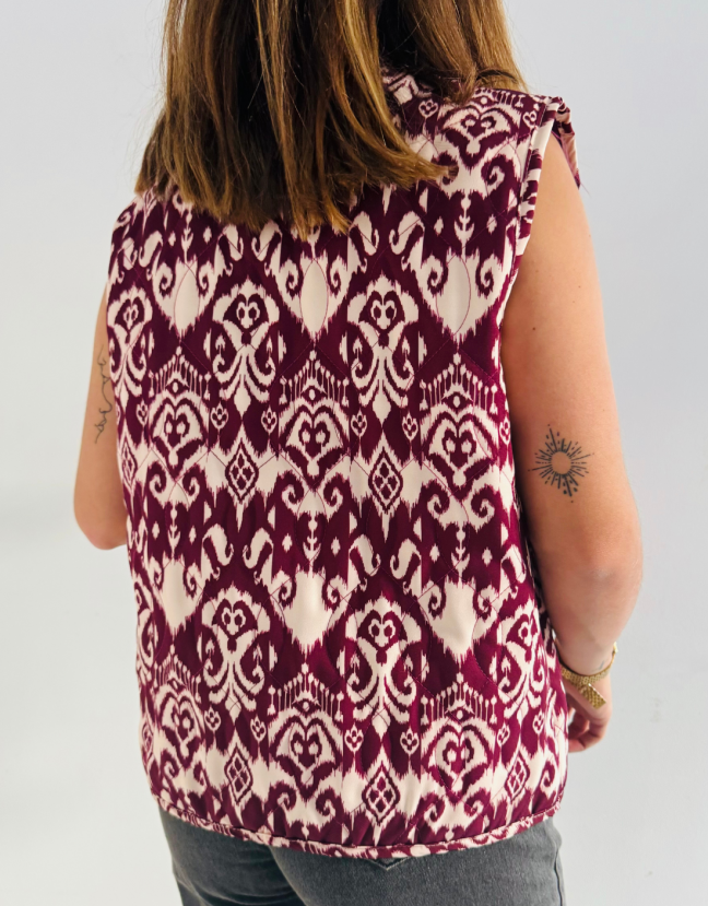Apportez une touche de couleur à votre garde-robe avec ce gilet sans manches bordeaux à motif.