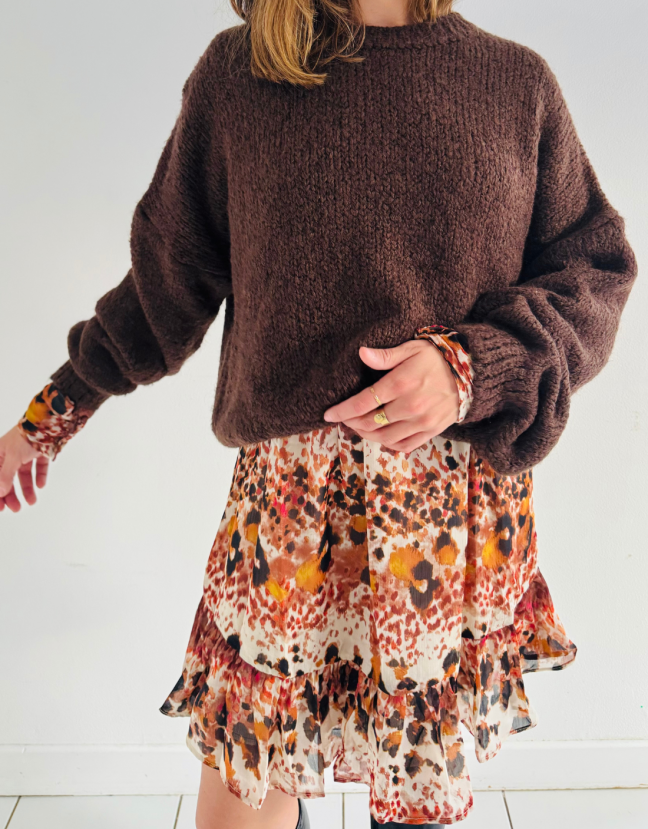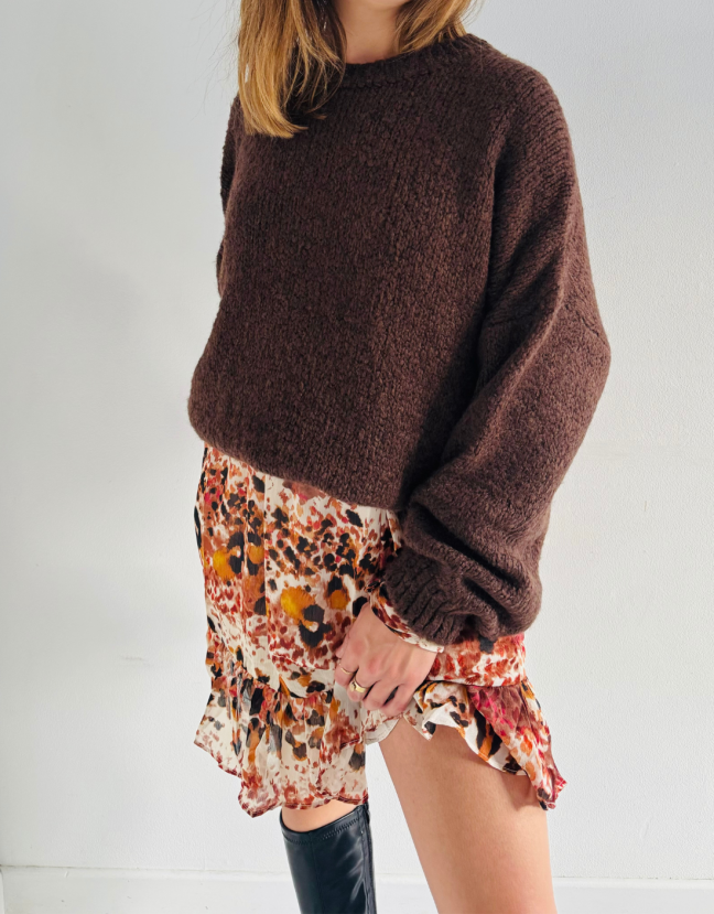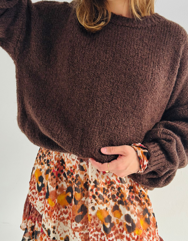 Craquez pour notre pull en maille uni, dans une teinte chocolat chaleureuse et tendance.
