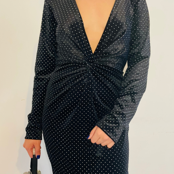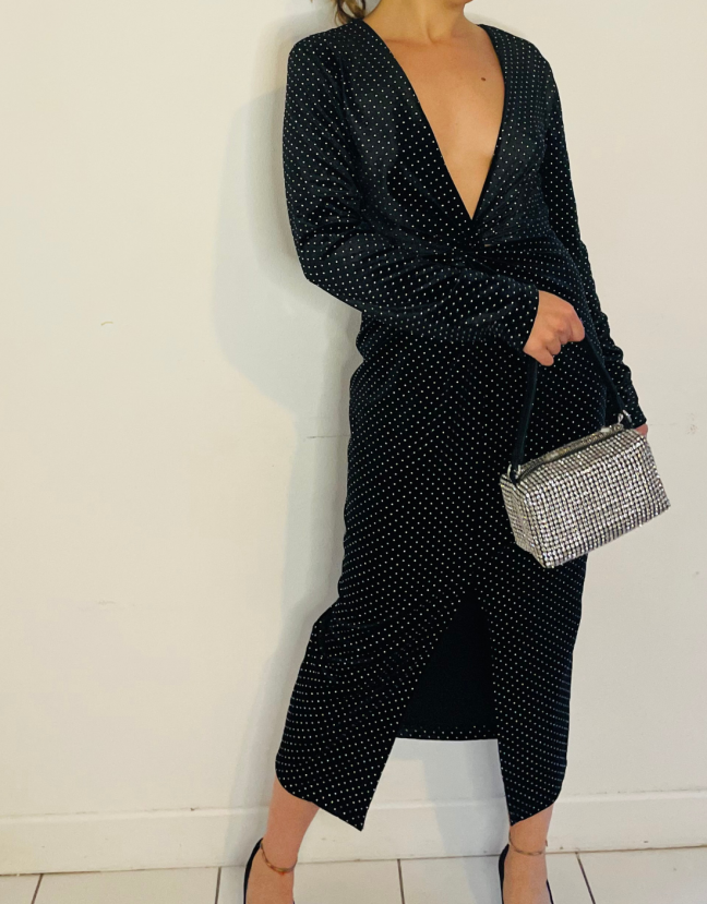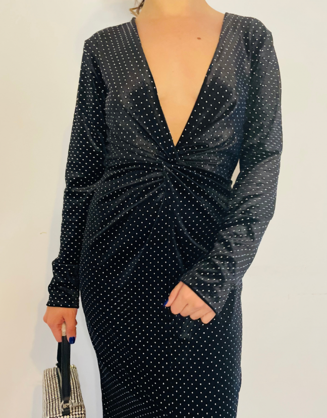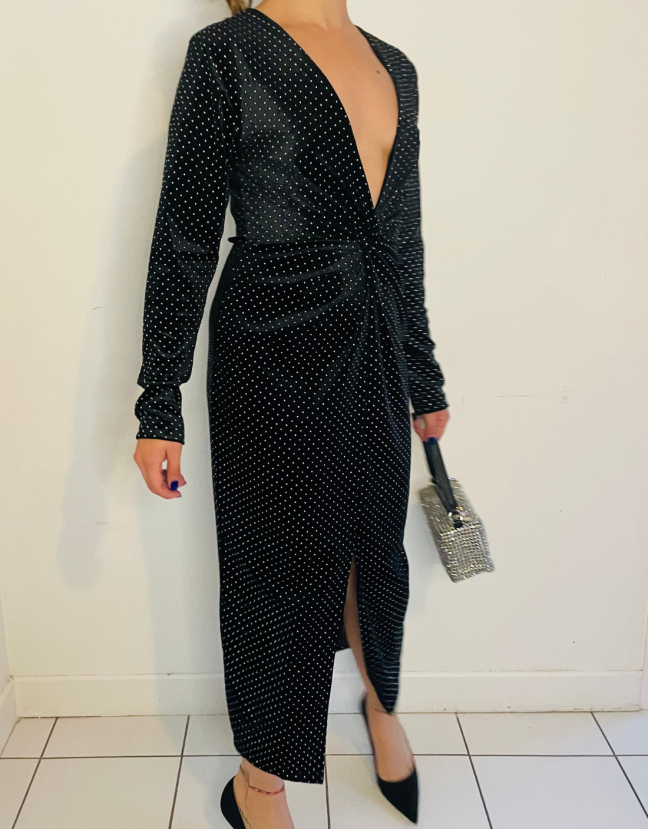 Description : Robe mi-longues en velours avec clous, décolleté profond, couture pour contrer la taille, fente à l’avant. Made in Italie.
