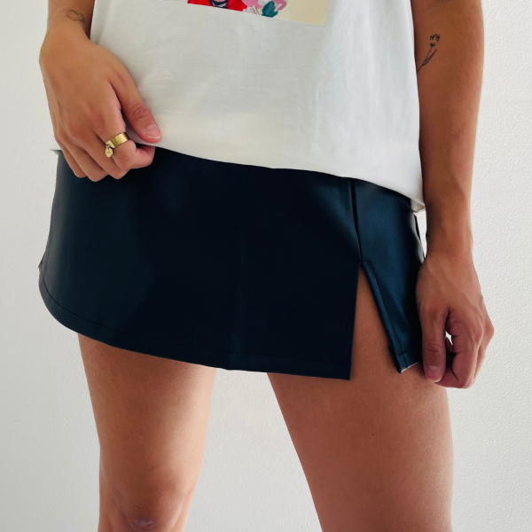 Optez pour cette jupe-short en similicuir noir, parfaite pour un look audacieux et moderne.