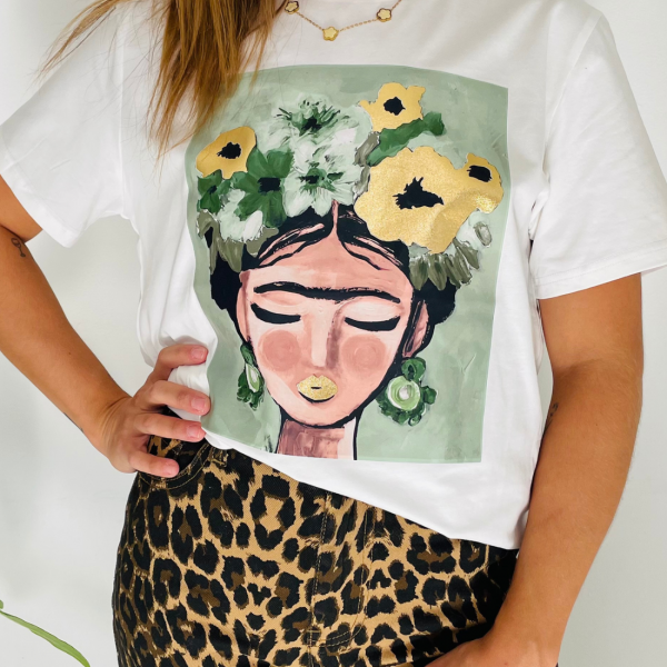 Exprimez votre style artistique avec ce t-shirt à motif Frida Kahlo, une pièce unique qui allie mode et art.