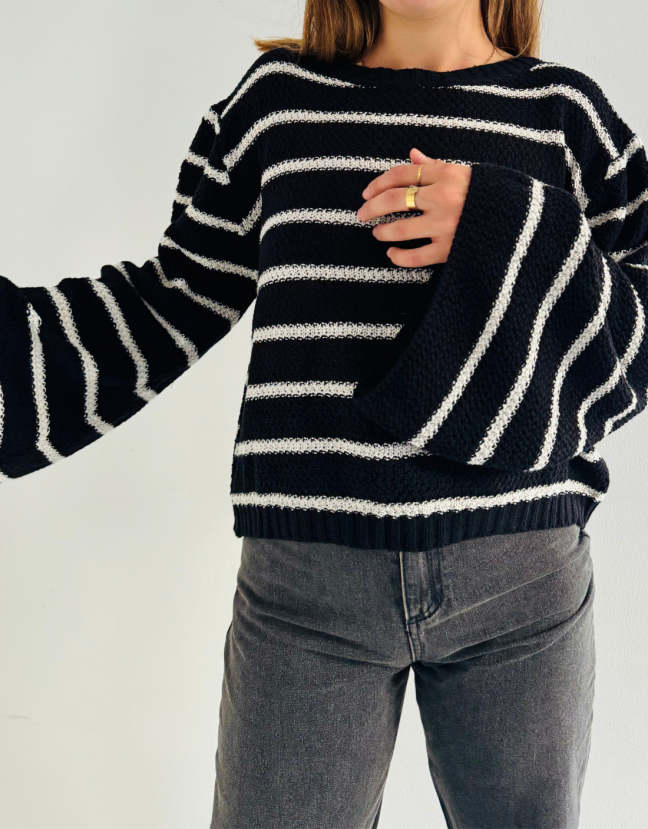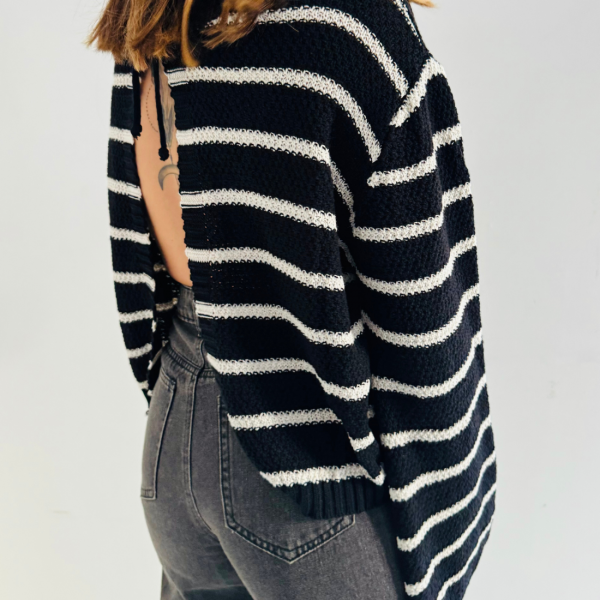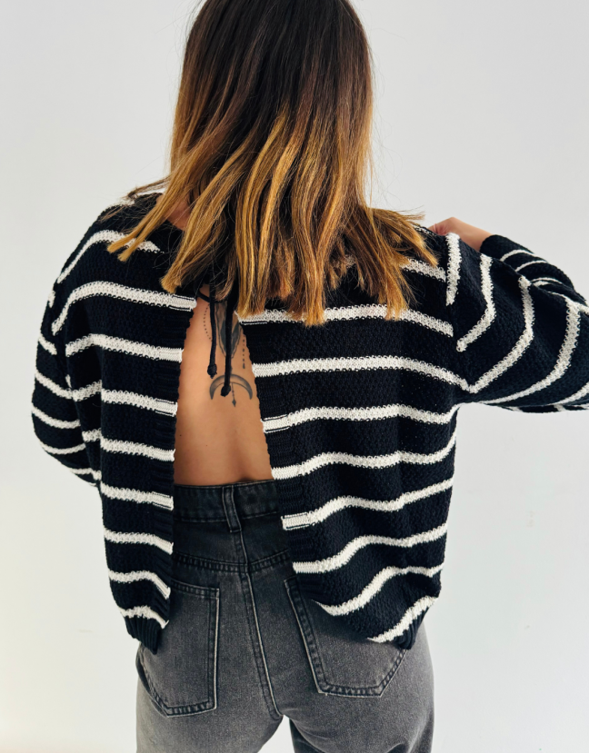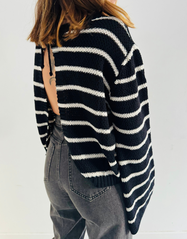 Adoptez la tendance marine avec ce top marinière à manches longues, twisté par un dos ouvert qui ajoute une touche audacieuse et féminine.